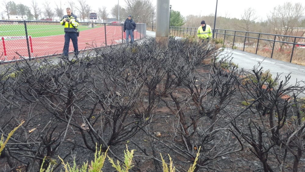 No one was hurt. Both light poles were scorched by the fires, and the college is still assessing the extent of the resulting electrical damage.