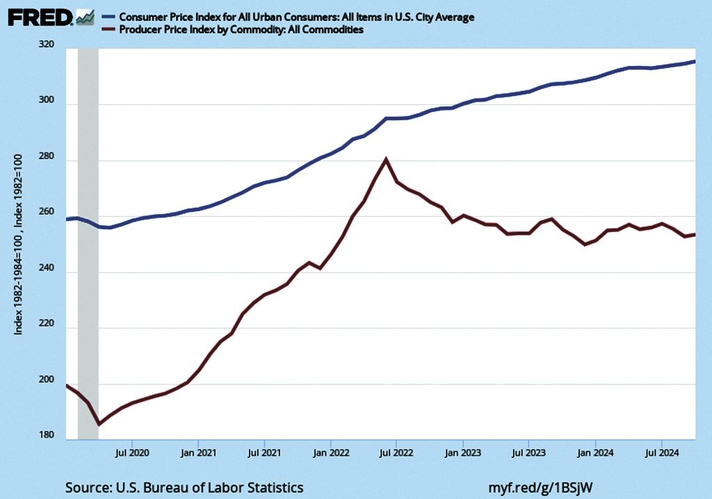 The top line is the Consumer Price Index—a measure of the prices households pay for basic goods. Inflation has steadily increased for consumers, but at a slower rate recently. The bottom line shows the Producer Price Index, a measure of the prices businesses pay for the things they need to make and sell. Producer inflation has been more volatile, rising rapidly until June 2022, but falling sharply since. There’s actually been deflation (falling prices) in the Producer Price Index for two and a half years.