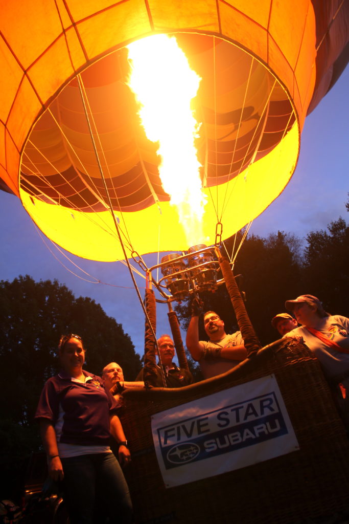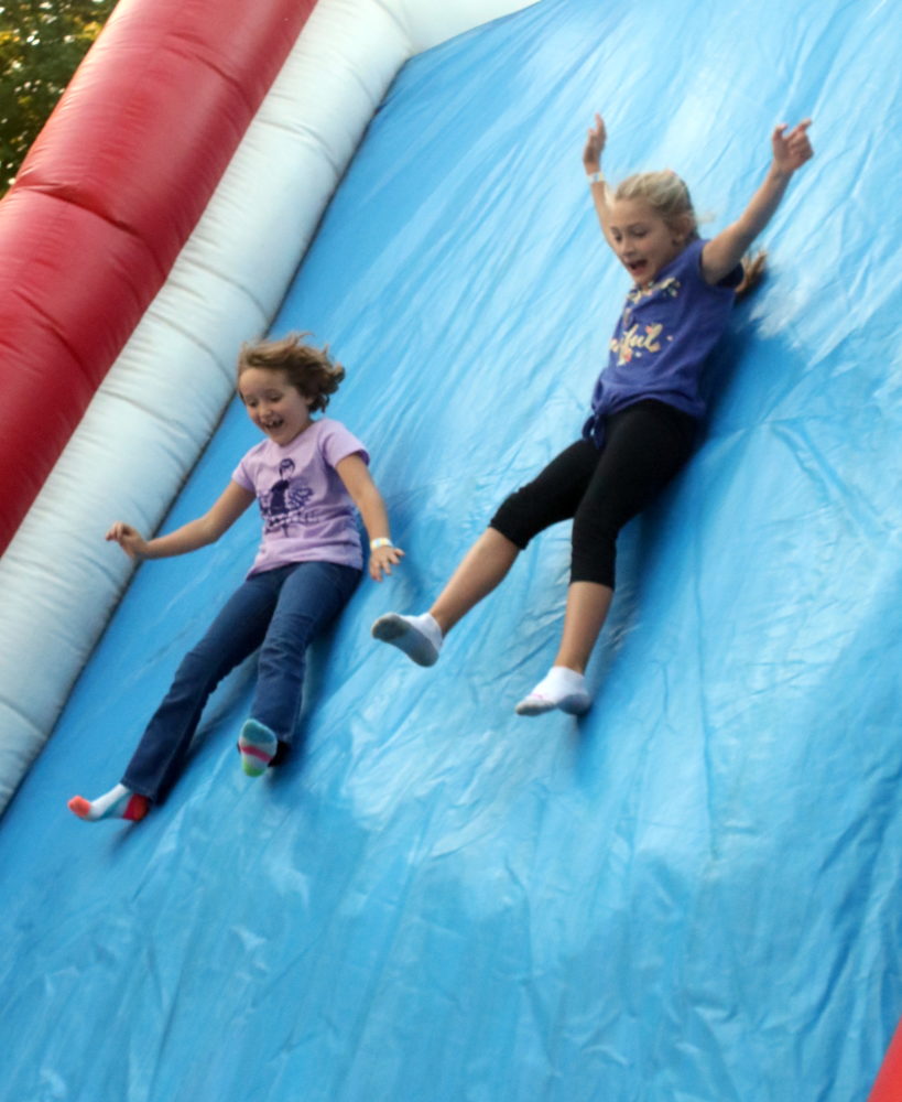Dave Markowitz, Town of Maryland, and Ben Wagoner, Bristol, sit inside the basket of the Wild Ride balloon surrounded by crew members Stephanie Douglas, Gofftown, Michael Butler, Cooperstown, Nick Scherer, Schenevus, and Beth McGown, Cooperstown, as they illuminate the hot air balloon during tonight’s balloon glow in Neahwa Park. At right, Savannah Wilson, Morris, and Emily Leonard, Pittsfleld, enjoy one of the inflatable attractions from the New York Bounce House. The festivities continue Saturday with the second annuall Rothenberger Run, live music, face painting, vendors, hot air balloons and more. (Ian Austin/AllOTSEGO.com)