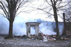 “Flames were leaping out of the roof,” said neighbor Mary Quinn, who lives across the street from 3138 Route 33, owned by Dorothy Newsom since the 1980s. Only the portico and a tall brick chimney were standing at dusk today.