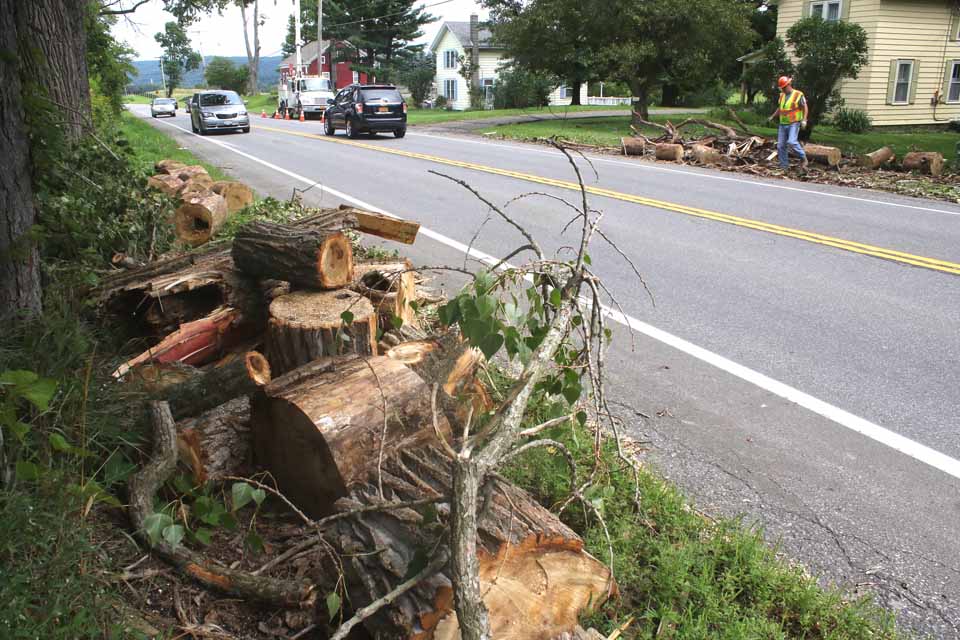 A Northern Utilities crew, with two ladder trucks and a pickup, were removing debris of trees that had been toppled just north of Smith Ford. Responding to a passing driver, one of the crew members said they hoped to have the wires repaired by mid-afternoon.