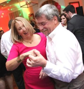 Joshua Truman, Friends of Bassett executive director, top photo, right, presents a framed program of the first Valentine’s Soiree to guests of honor Dr. John May and his wife Amanda Saturday at The Otesaga. John May is the recently retired longtime director of NYCAMH (the New York Center of Agricultural Medicine & Health); Amanda May was a Friends fundraiser on several key campaigns. The Soiree replaces the New Year’s Eve Gala as the Friends’ main annual fundraiser. After dinner, partygoers like Bassett surgeon Bob Moglia and wife Maureen, inset photo, danced the evening away. (Ian Austin/AllOTSEGO.com)