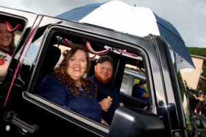 After a downpour delayed Cooperstown Central School’s 1:30 p.m. Commencement 2020 for 45 minutes this afternoon, Anya McGoldrick, left, and Natalie Fountain, top photo, lead a procession of 78 seniors through cheers and beeping horns in the school parking lot to the ceremony in the field between the high school and elementary schools. Inset left, Tammi Kelly and Don Corns – their grad is Morgan Kelly – opened a golf umbrella through their sunroof as shelter from the rain. The seniors will be honored with a parade through downtown Cooperstown at 5 p.m. – head- on down! (Jim Kevlin/AllOTSEGO.com)