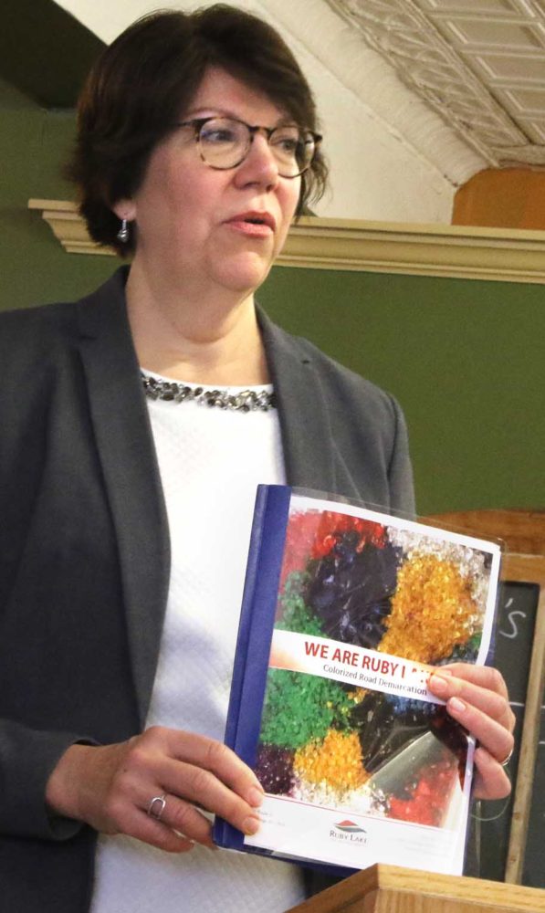The 25-year-old company recycles glass, and Ruby Lake colorizes glass that can then be used for crossing stripes and other markings on road pavement. Andela said her company currently has a contract with New York City to stripe pavement; if you’re there, you can see it in the vicinity of the Flatiron Building. The product offers “color, friction and durability,” with resulting stripes withstanding 4-5 years of traffic.