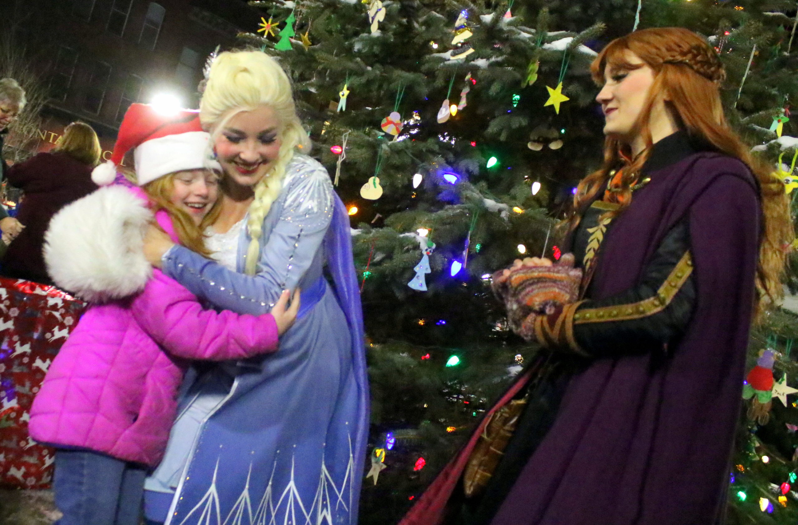 Oneonta’s Autumn Fox embraces Hill City Ice Queen Elsa, and sister Anna, next to the Christmas Tree in Muller Plaza this evening following the annual Tree Lighting ceremony there. The two led the crowd in songs from Disney’s “Frozen” movies before meeting and posing for pictures with their fans. Inset, Krystal Poole, 16, a junior at Charlotte Valley High School, sings Christmas carols for the crowd. Poole, nicknamed “The Country Sweetheart,” and is an ambassador for the “Toys for Joy” toy drive, which asks for new toys to be donated as Christmas presents for those in need. (Ian Austin/AllOTSEGO.com)