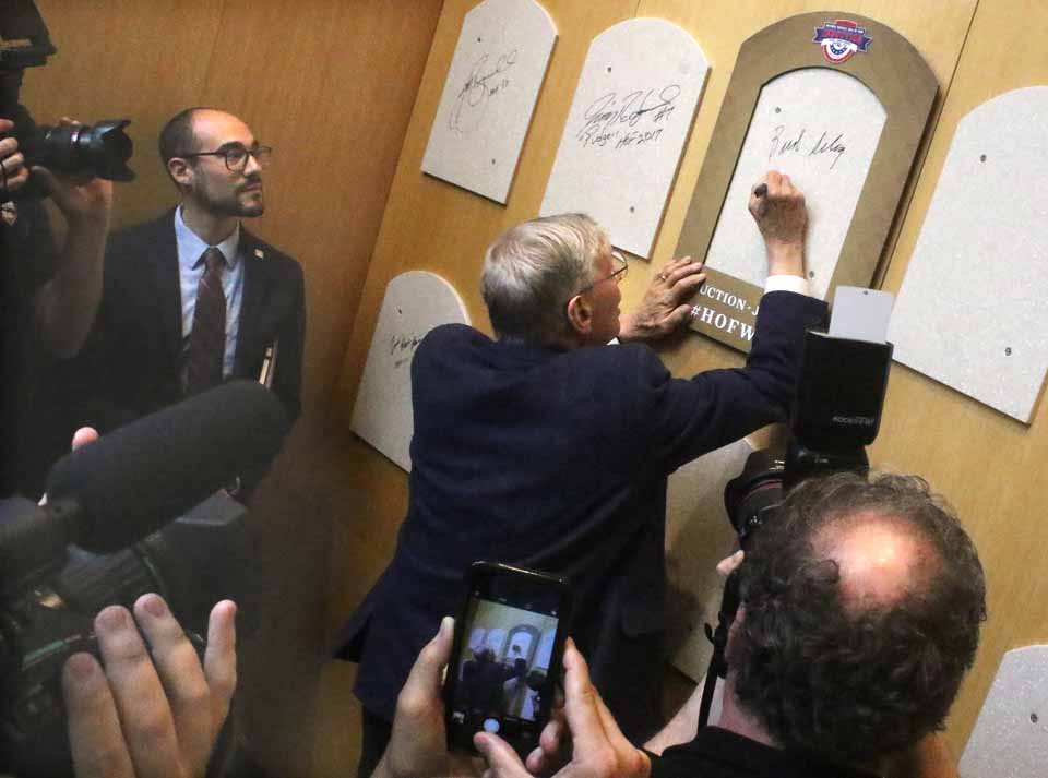 A few minutes ago, Bud Selig, the former MLB commissioner, signs the base where his plaque will be mounted the evening of Sunday, July 30, after he joins players Jeff Bagwell, Tim Raines and Pudge Rodriguez, and fellow executive John Schuerholz in the National Baseball Hall of Fame’s 2017 Induction that afternoon at the Clark Sports Center fields. As commissioner, Selig had been on the Induction rostrum for 17 years (1998-2015), but confessed he was awed during today’s orientation at the thought of joining baseball’s immortals in the Hall of Plaques. Making a point of stopping at Hank Aaron’s plaque, he recalled that weekend in 1981 when inductees were to be announced. Aaron kept calling Selig’s office: “‘Have you heard?’ ‘Have you heard?’ So when we heard, he was the first one we called,” said the former commissioner recalled. (Jim Kevlin/AllOTSEGO.com)