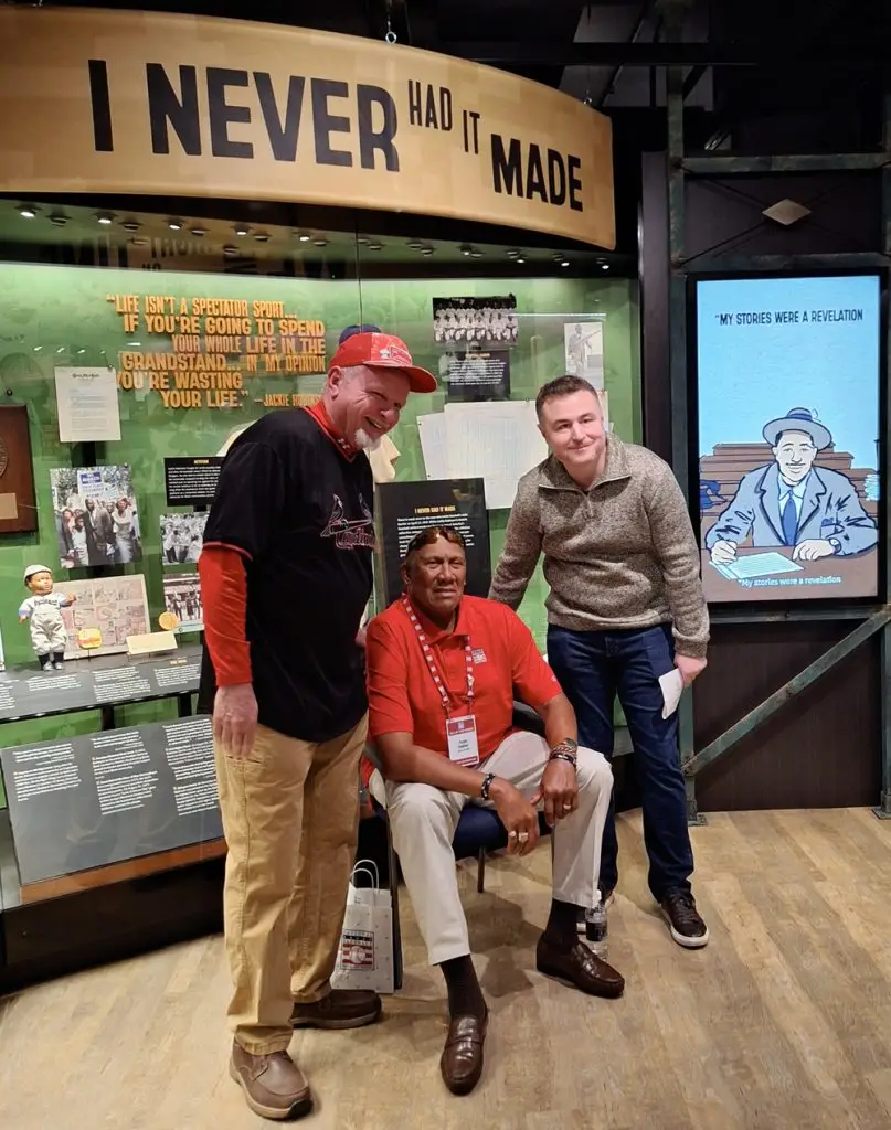 Hall of Fame shortstop Ozzie Smith (center), posing with fans in the “Your Team Today” exhibit. Smith won 13 Gold Glove Awards and was named to 15 National League All-Star teams in his 19-year career. A frequent visitor to Cooperstown, Smith was named to the Hall of Fame’s Board of Directors in 2023. (Photo by Charlie Vascellaro)