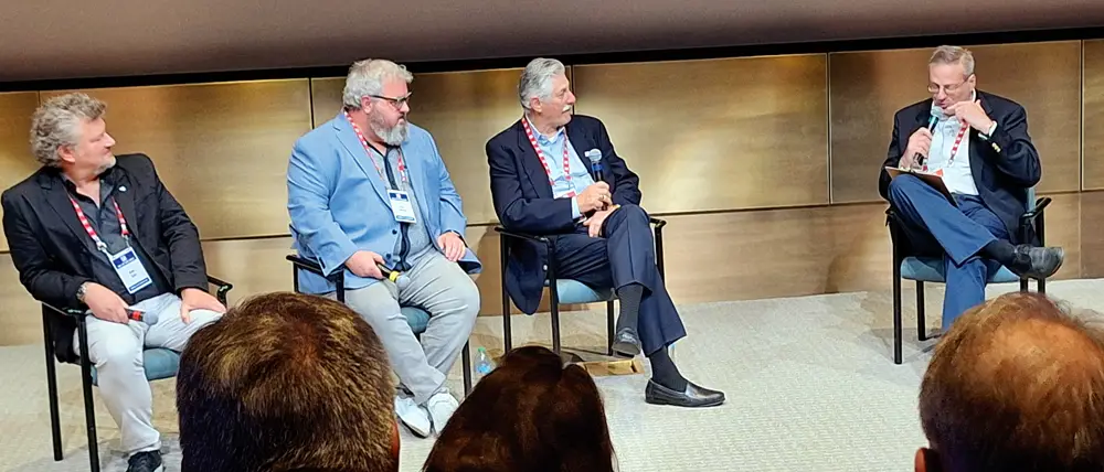 From left, “Just A Bit Outside” producer Kelly Kahl, director Sean Hannish, and former Milwaukee Brewers pitcher Rollie Fingers (1981-1985) participate in a panel discussion with Hall of Fame Manager of Digital and Outreach Learning Bruce Markusen after the screening of their documentary on the 1982 Milwaukee Brewers on Friday, May 23, part of the Hall of Fame’s first annual Film Series. (Photo by Charlie Vascellaro)
