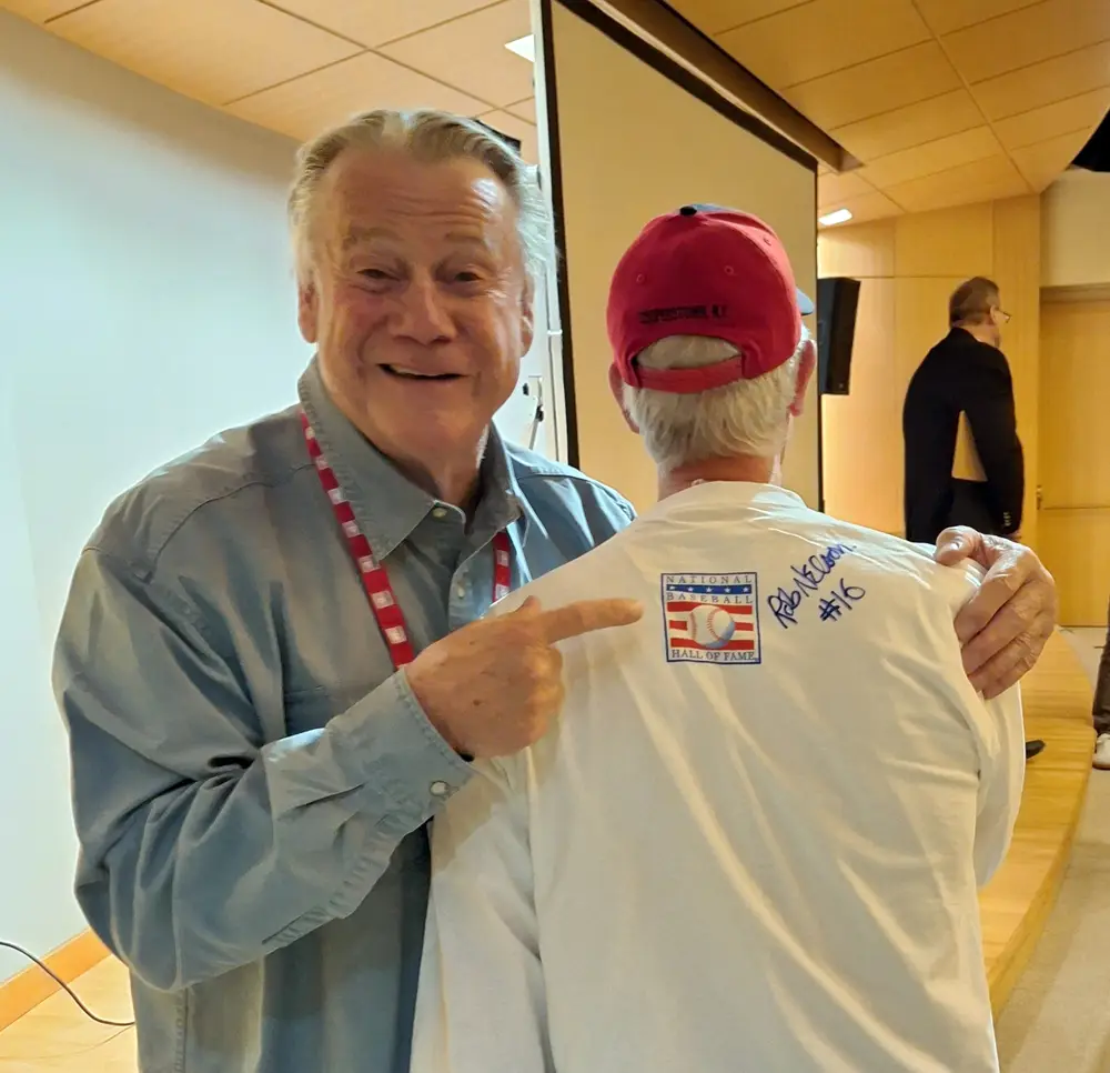 The culmination of the first annual Hall of Fame’s [six] Film Series, “The Battered Bastards of Baseball” (2014) is a documentary about the independent minor league Portland Mavericks baseball team (1973-1977) owned by actor Bing Russell, father of actor Kurt Russell, who also played for the team and served as its vice president. A rag-tag bunch of rejects and cast offs from Major League Baseball’s franchises and organized affiliates operating on a shoe-string budget, the Mavericks took the Class A-Short Season Northwest League by storm, nearly winning the 1977 league championship. Pitcher/author Jim Bouton, of “Ball Four” fame was also on the team, using it as a springboard to resurrect his major league career. Bouton helped teammate Rob Nelson create the “Big League Chew” brand of bubblegum while they were with the Mavericks in Portland. (Photo by Charlie Vascellaro)Rob Nelson, pitcher and ticket salesman for the Portland Mavericks “Battered Bastards of Baseball” team and creator of “Big League Chew” bubblegum, with fan Paul Boone of Fernandina Beach, Florida. (Photo by Charlie Vascellaro)