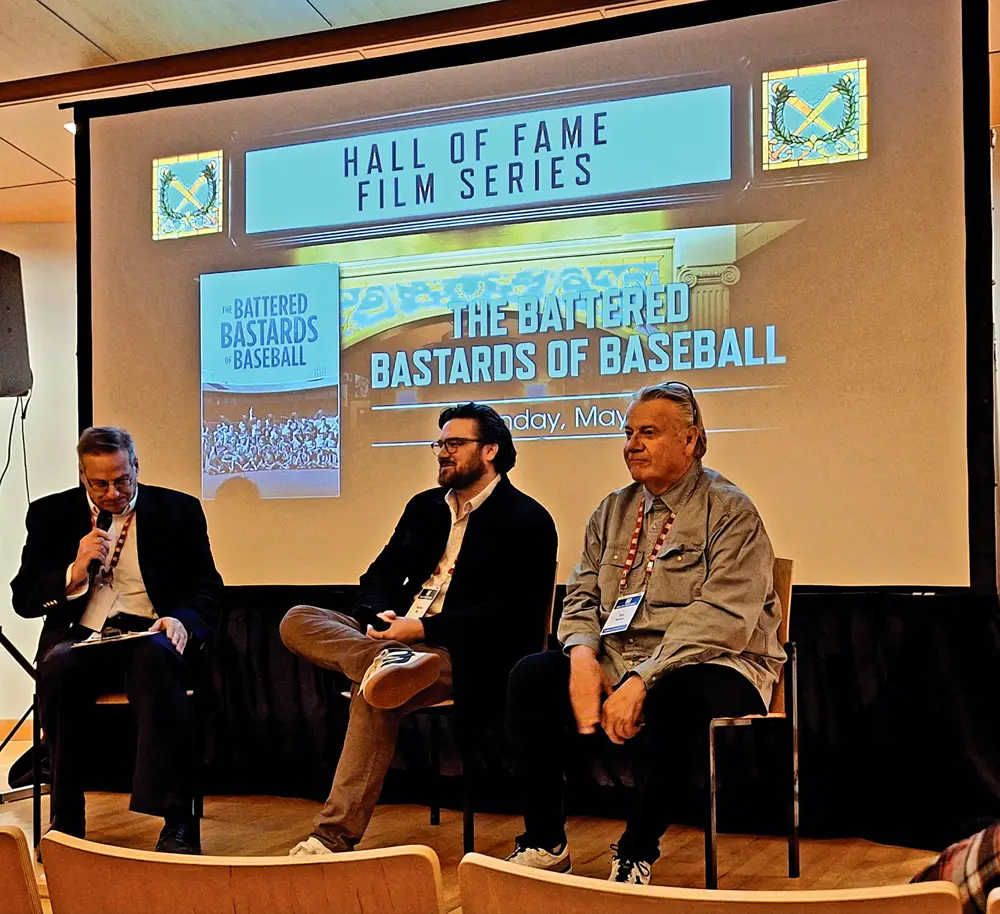 Hall of Fame Manager of Digital and Outreach Learning Bruce Markusen (left) interviews Maclain Way (center), co-director of “The Battered Bastards of Baseball”—a documentary about the independent minor league Portland Maverick’s baseball team (1973-1977)—and player Rob Nelson (right), creator of “Big League Chew” bubblegum, who earned his only professional win for the team in 1977. (Photo by Charlie Vascellaro)