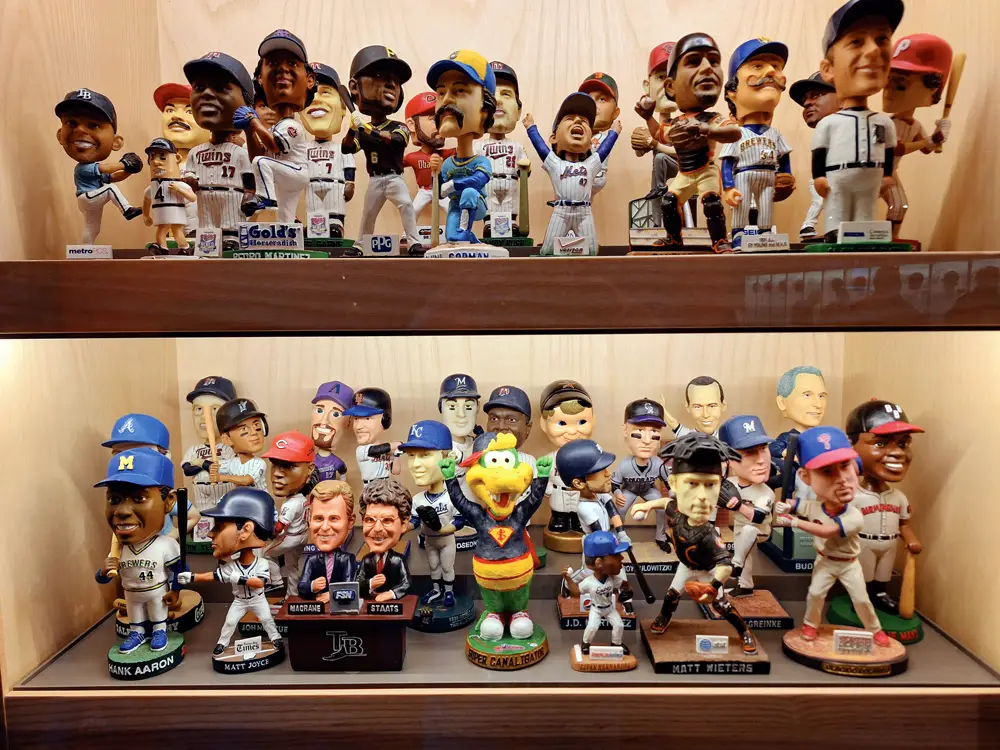 These two shelves of Bobbleheads are part of the more than 600-piece “Getting the Nod” collection now on display at the Hall of Fame. (Photo by Charlie Vascellaro)
