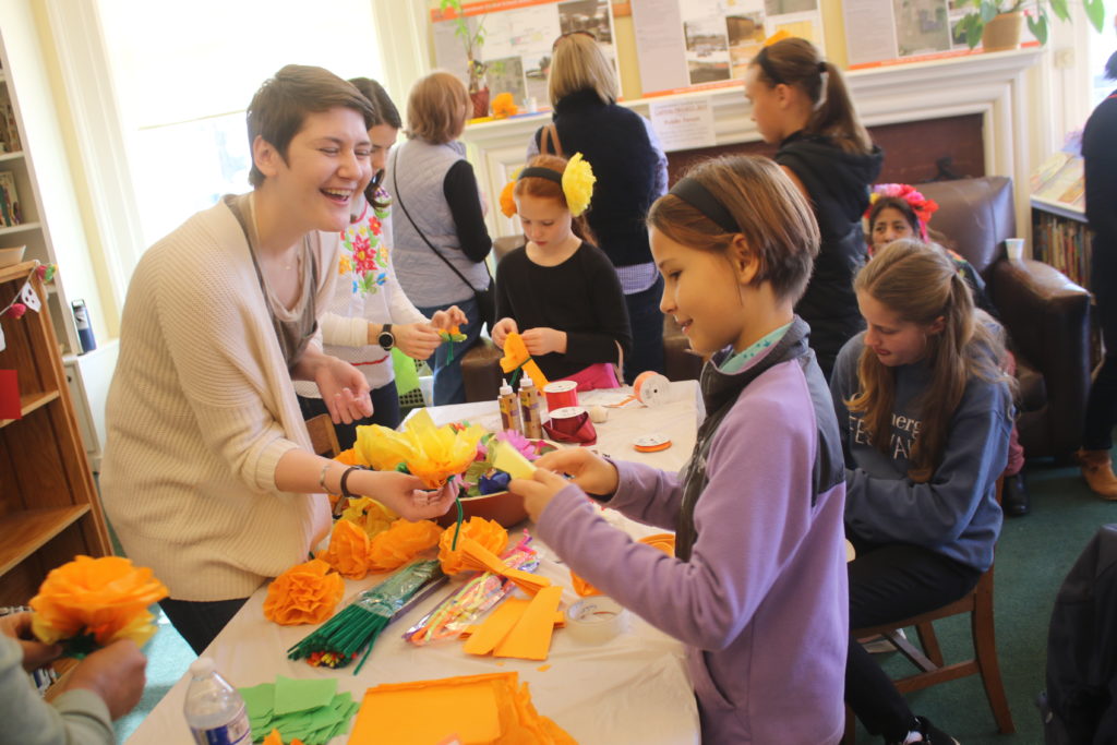 The Cooperstown Graduate program hosted a Dia de los Muertos event at the Cooperstown Library this afternoon celebrating Dia de los Muertos, The Day of the Dead. Children and their families would come and enjoy tamales, cookies, crafts, storytelling and more. Above, Cooperstown Graduate student Kirbie Sondreal helps Ciara Kaltenbach, Cooperstown make decorative paper marigolds which serve as a guide for spirits returning to the land of the living. At right, first year Cooperstown Graduate Program student Mary Horbiki and CGP graduate Viri Choy, Oneonta, teach children in Spanish and English about the tradition of leaving offerings for the dead on an alter decorated with flowers, food and images of loved ones who have passed on. The offerings are meant to attract the spirits to the alter so their memory can be kept alive. (Ian Austin/AllOTSEGO.com)