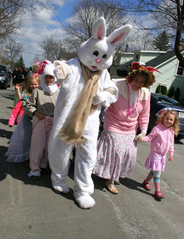 Mr, and Mrs. Bunny lead Julia Bohm, Tara, Tess and Lincoln Dilorenzo and the rest of the kids down Pioneer Street in Cooperstown for an Easter parade and tea at the Tunnicliff Inn.