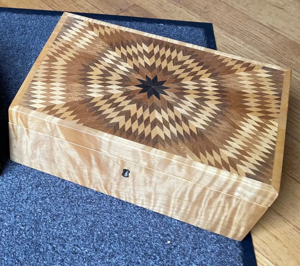 The Art Garage exhibition features three 18th-century style items including a dressing mirror, two jewelry boxes emblazoned with a quilt pattern in a variety of woods and a cocktail tray that suggests the 1930s.