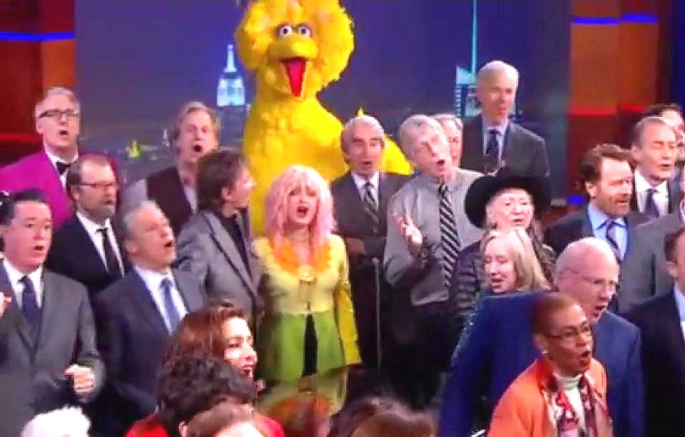 Oneonta’s George Saunders is at left, behind and between Stephen Colbert and Jon Stewart, singing “We’ll Meet Again” in last night’s “Colbert Report” finale.