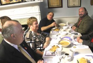 Dave Bliss, Republican chair of the Otsego County Board and a Rotarian, pours coffee for state Sen. – and candidate – Jim Seward, R-Milford, a few minutes ago at the traditional Cooperstown Rotary Club Election Day pancake breakfast at the Vets’ Club. With the senator are, from his left, daughter-in-law of two months Kelly Ann, daughter Lauren, wife Cindy and son Ryan. Seward is being challenged today by Democrat Joyce St. George, Margaretville area. Inset, Democratic kingmaker Richard Sternberg joined the Republican table that includes, at left, county Sheriff Richard J. Devlin, Jr. and County Clerk Kathy Sinnott Gardner; at right is Republican County Chair Vince Casale, who is also a top adviser to Republican Marc Molinaro’s campaign against Gov. Andrew Cuomo. Devlin is being challenged by Republican Bob Fernandez, a retired state trooper who appears on the Democrat line. Sinnott Gardner is unopposed. “I like these people,” said Sternberg. The polls are open across Otsego County until 9 p.m. (Jim Kevlin/AllOTSEGO.com)