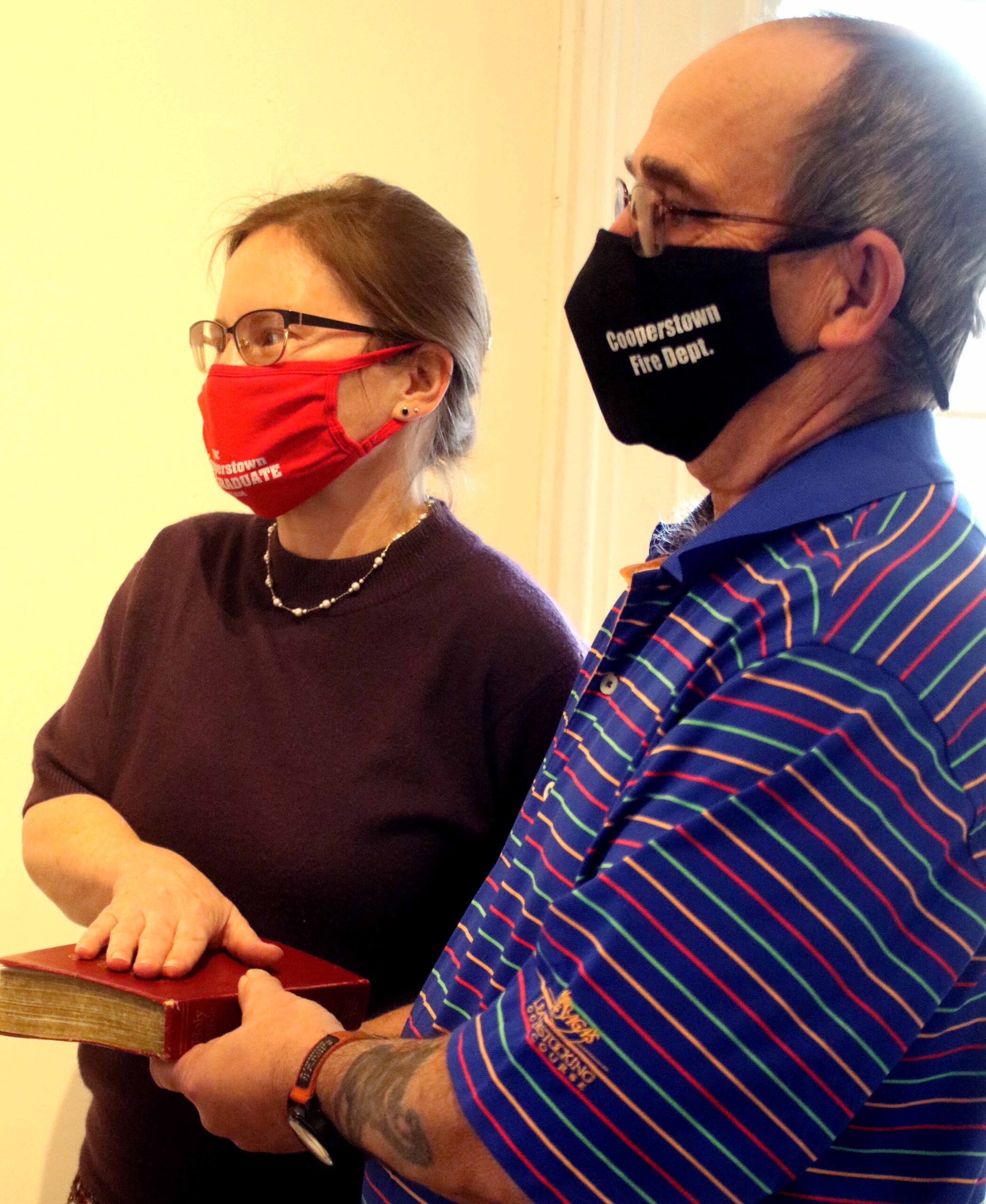 The Bergene family gathers around daughter Hanna, 29, after she was sworn in as the Cooperstown Village Board’s newest trustee this evening by Village Clerk Jenna Utter.  With Hanna are her parents Gregory and Susan, right, and Henry Bauer, left.  Hanna was elected March 16, as was veteran Trustee Cindy Falk, inset right, whose husband Glenn holds the Bible for the fifth time as his wife takes the oath.  Mayor Ellen Tillapaugh Kuch reappointed Falk as deputy mayor, a position she’s filled for the past several years.  With the addition of Hanna, the seven-member Board of Trustees achieved a majority of women – Bergene and Falk, Mayor Ellen Tillapaugh Kuch, and Trustee Jeanne Dewey. (Jim Kevlin/AllOTSEGO.com)