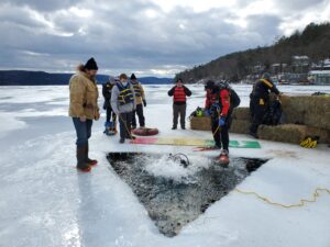 The SUNY Oneonta Biological Field Station volunteer diving team held an ice-dive training February 12 for the first time this winter with the ice one foot thick and air temperatures in the 40s. The dive team works with the field station and the Village of Cooperstown to maintain buoys, science instruments, and study the ecosystem of Otsego Lake. Pictured from left to right Ed Lentz, Lucas LaTarte (holding the safety line), Kari Minissale (noting the divers’ direction), Wayne Bunn, Tiffany Valenti, and PADI Master SCUBA Diver Trainer Paul Lord. Diving are Noel Odell and David Turner. Photo for AllOtsego.com by Larissa Ryan.