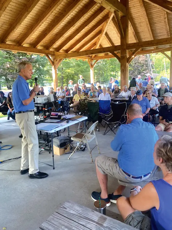 As the clock struck 9, a large group gathered under the pavilion to listen to OLA President Jim Howarth’s opening remarks. Howarth began the meeting by thanking attendees for coming and recognizing all of the contributing organizations that partnered with OLA on projects involving Otsego Lake. Those organizations include the “Watershed Supervisory Committee, the SUNY Oneonta Biological Field Station, the Otsego County Conservation Association, the Lake and Valley Garden Club, and the Community Foundation of Otsego County’s Watershed Sustainability Fund,” Howarth noted.