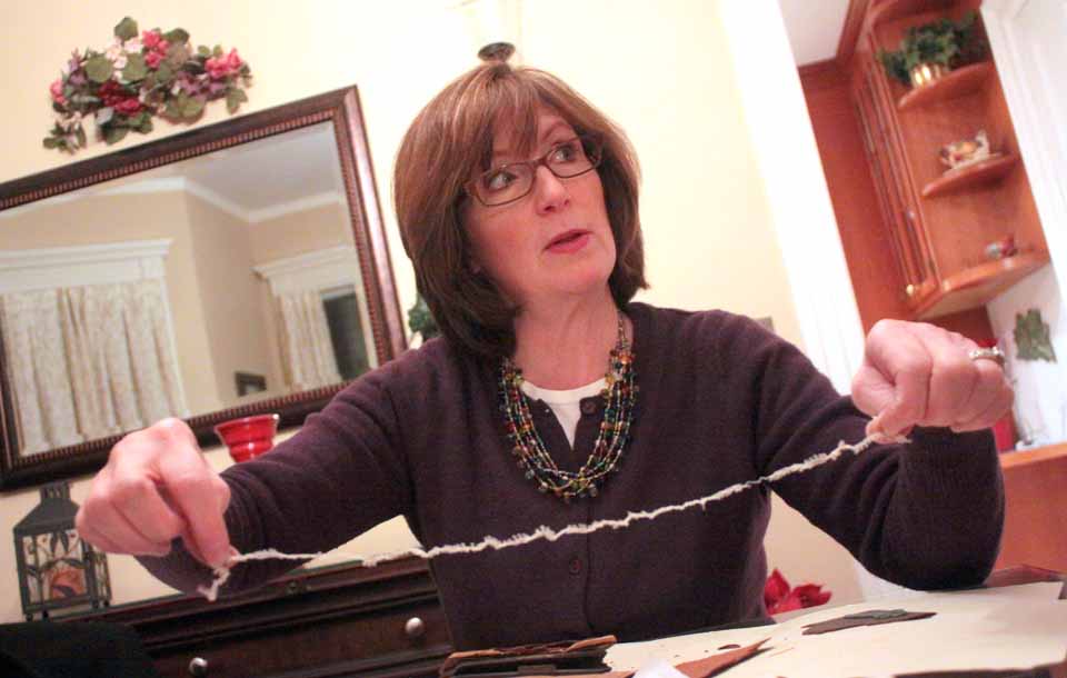 Also in the wallet was a key and a folded list for “five yards skirt lining, three yards taffeta, white China silk, a pretty belt and a launderable collar” with a scrap of dark purple taffeta and a delicate piece of lace tucked into the pocket. “We figured she was dressing up for a party or a big event at the school,” Lisa said. “This trim looks like it went around a collar. You’d have to be pretty remarkable to sew this onto anything.”