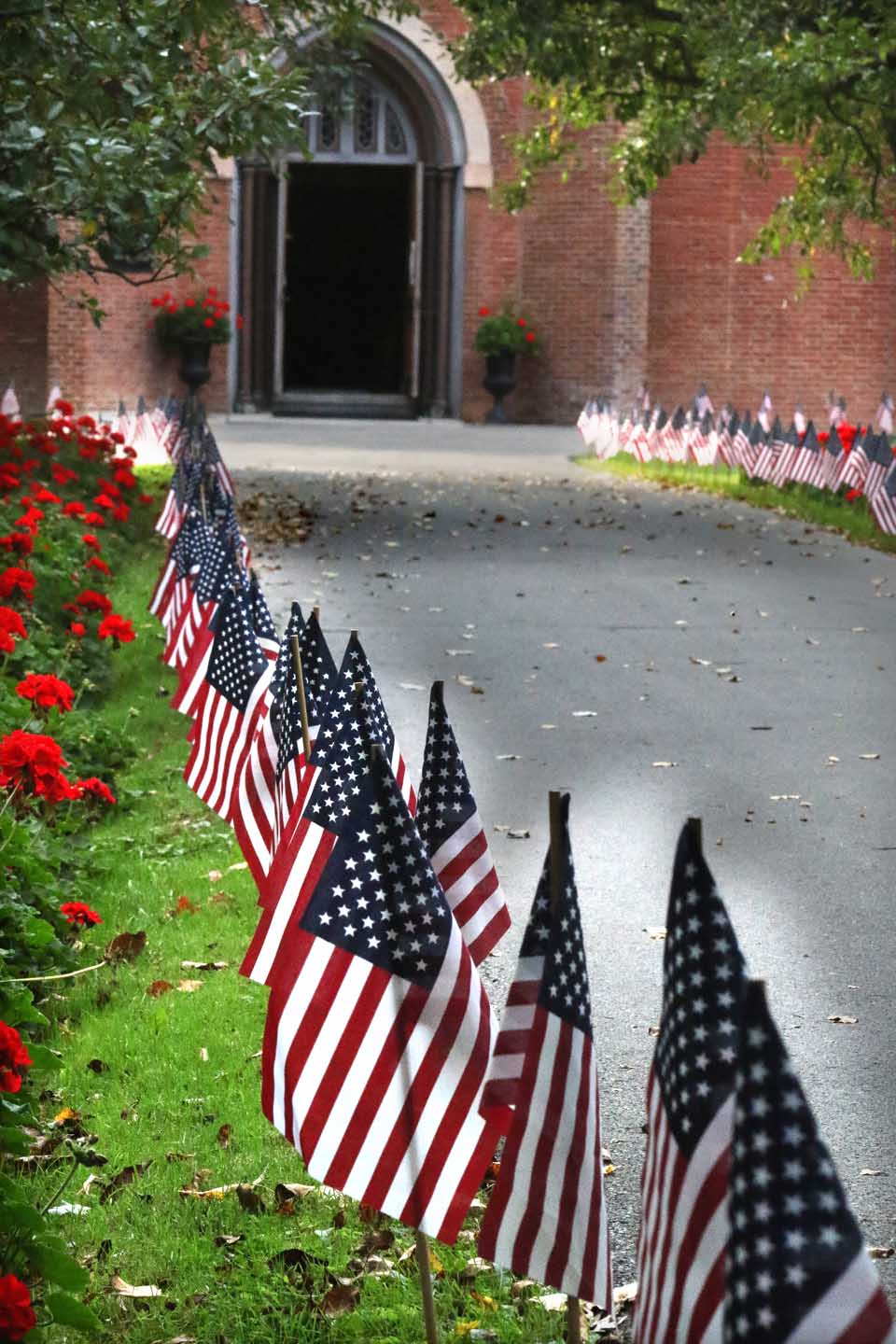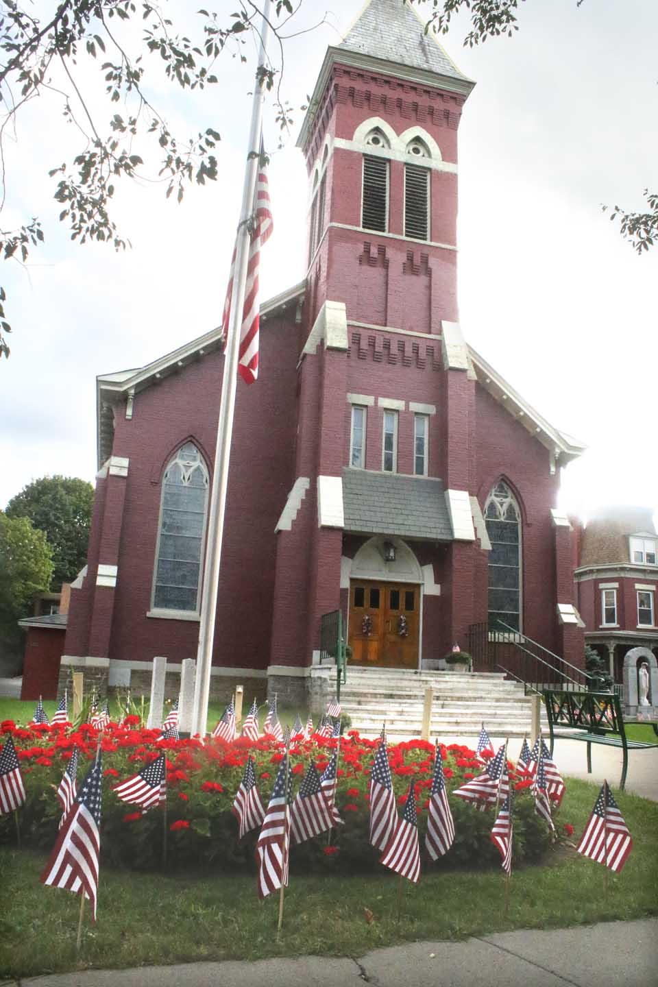 Rudy’s proprietor Fred Lemister ponders the lessons of 9-11 while inspecting the memorial that has been growing year to year in his front window on Main Street, Cooperstown, since terrorist hijacked airliners and drove them into the Twin Towers of the World Trade Center on Sept. 11, 2001, 19 years ago tomorrow. The exhibit includes a portrait of Father Michael F. Judge, the NYFD chaplain, who suffered a heart attack and died on arriving at the scene; Lemister, a retired EMT and firefighter, considers Judge to be the first victim of the attack. Again this year, Cathy Raddatz, whose brother George Morell, a Cantor Fitzgerald broker, died in the Towers, is placing hundreds of small flags around the village, including displays at St. Mary’s Catholic Church, Christ Episcopal Church and Lakefront Park. Lemister reported some patrons at his store ask him, “What’s 911?” He said, “Those who don’t understand history are doomed to repeat it.” In all, 2,977 died in the Twin Towers, the attack on the Pentagon, and the airplane crash in Shanksville, Pa., famed for the famous cry, “Let’s Roll.” (Jim Kevlin/AllOTSEGO.com)