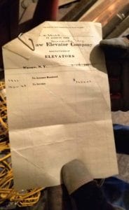 The existing freight elevator will be restored and converted into a passenger elevator. In excavating, he found the 1923 order for the elevator: $1,650, or $24,390.67 in today’s dollars.