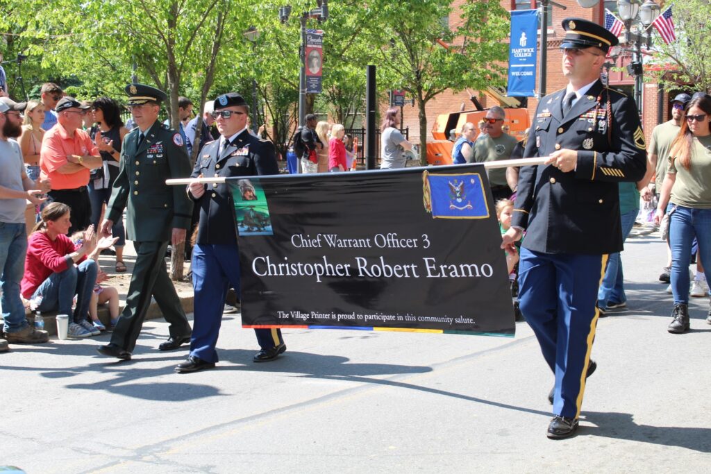 OTSEGO COUNTY—Municipalities throughout Otsego County held parades on Monday, May 29 to honor and mourn military personnel who died while serving in the United States Armed Forces. Below, representatives of American Legion Post 579, Cooperstown, deliver remarks in remembrance of fallen service members before a wreath laying ceremony (photo by Wriley Nelson). Below middle, Oneonta celebrated one of its own this year, fallen Army officer Christopher Eramo. Read more on page 11 (photo by Joel Plue). The 61st annual General Clinton Canoe Regatta was held May 26-28. The 70-mile race on Sunday began just north of the Village of Cooperstown at Brookwood Point and finished in Bainbridge. For complete race results, visit https://www.canoeregatta.org/race/results.php (photo at bottom by Joan Dubhuir).