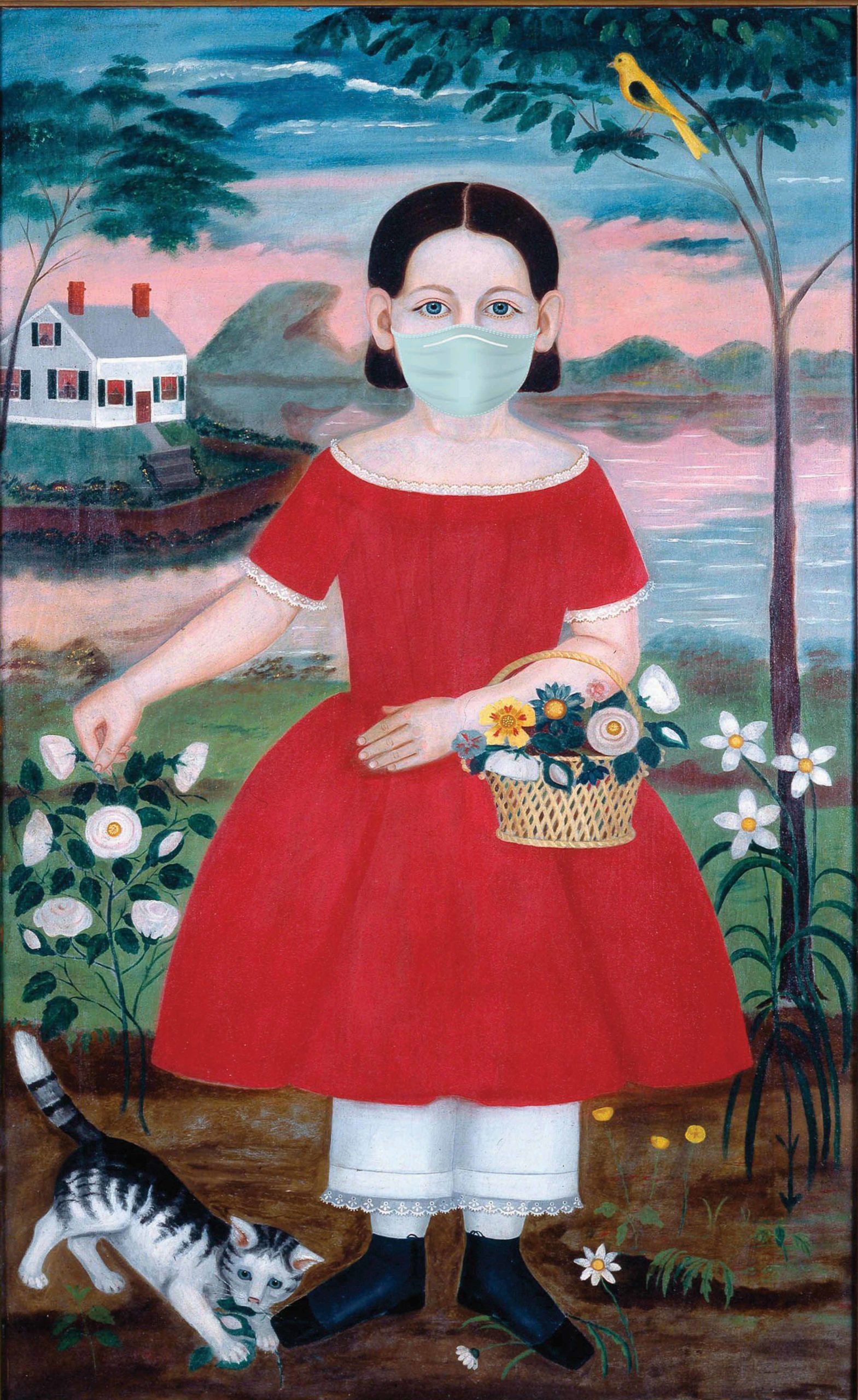 To enforce mask wearing when The Fenimore Art Museum opens on Friday, July 3, Assistant Curator James Matson Photoshopped masks over several pieces from the museum’s collection, including “Laura Hall” (1808) by James Brown, and “Picking Flowers” (1840) by Samuel Miller.