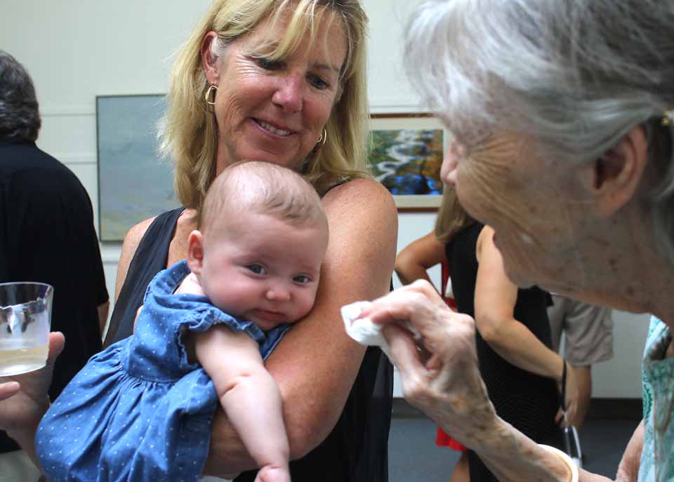 Cooperstown Art Association Executive Director Janet Erway, in top photo, presents a juror citation to artist Paul Marcellino of Worcester, for “Lesley,” at this evening’s opening reception of the CAA’s juried art show, National 2016, at its 22 Main St. galleries. Charles Kiefer is at the mike, announcing the prize winners. At left in top photo, young Valerie Antanavige takes in the scene, escorted by her grandmother, Judith Ellers, who summers in Westford. In photo at right, while her parents take in the show, Delaney Lookadoo’s grandmother Maureen Heroux, Cooperstown, and great-grandmother, Pat Maney, visiting from Cleveland, Ohio, are visibly delighted to tend the 3-month-old. (Jim Kevlin/AllOTSEGO.com)