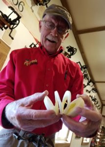 Proprietor Bill Michaels welcomes a bus load of SPOOMERS, old mill enthusiasts, to the Fly Creek Cider Mill this morning. The SPOOMERS are here from around the country this weekend for the annual convention of the Society for the Preservation of Old Mills (SPOOM), which is underway at Hanford Mills Museum in East Meredith. At right, Charlie Michaels, Bill’s dad, shows off a freshly peeled and cored apple from a Daisy corer from the early 1900s. The Daisy is one of 200 apple peelers on display upstairs at the mill, which has been turning apples into cider with its water-powered Boomer & Boschert press since the mid 19th century. (Ian Austin/AllOTSEGO.com)