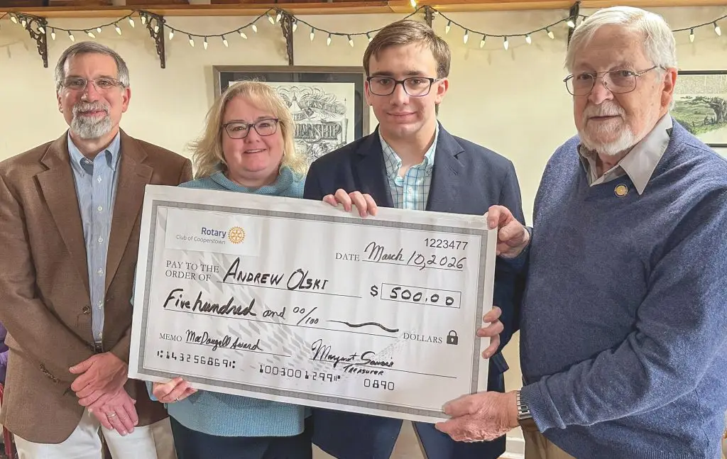 COOPERSTOWN—Cooperstown Central School junior Andrew Olski is the winner of the inaugural Hugh C. MacDougall Essay Contest. The writing competition, sponsored by the Rotary Club of Cooperstown, is in honor of longtime Rotarian Hugh MacDougall. The contest is open to juniors enrolled at CCS and judged by faculty members, officials said. Olski was awarded a cash prize of $500.00 and attended a luncheon meeting hosted by the Rotary Club.