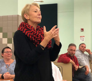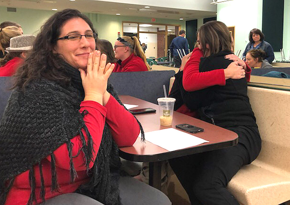 OCA Parent Kim Hastings is a picture of delight, above, as the Unatego Central school board announced a few minutes ago that the Oneonta Christian Academy’s $100,000 bid for the vacant Otego Elementary School has been accepted. Seated behind Hastings, OCA board member Rita Oellerich and Elizabeth Cook, 12th grade teacher and director of programming, embrace. The vote was unanimous, with board member Dick Downey saying the sale “maintains the heart of the community.” Inset left, OCA school board Vice President Julie Dostal expresses appreciation. The OCA will begin holding events at the Mission-style 1931 building that dominates the village’s downtown immediately, Cook said, and plans are to conduct summer school there next year, and to start classes there in September. “All we’ll need is the keys,” Cook said. (James Cummings/AllOTSEGO.com)