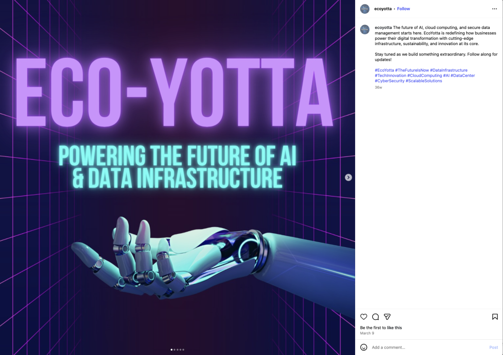 “The post that was removed says ‘Eco-Yotta powering the future of AI & data infrastructure,” he said, referring to content posted online at the Instagram account @ecoyotta. The post also contained hashtags: “#EcoYotta #TheFutureIsNow #AI #DataCenter.”