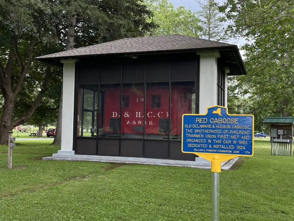 This marker in particular was placed to commemorate the historic red caboose located in Neahwa Park. In 1883, the train car was the meeting place of eight railroad workers who joined together to form the Brotherhood of Railroad Brakemen, later renamed to the Brotherhood of Railroad Trainmen in 1890. This was one of the earliest—and became one of the largest—labor organizations in the country, lasting until its dissolution in the 1960s to merge with various other unions. Seeing the importance of the red caboose, the union and its partners petitioned for the car to be restored, and it was moved to its current location in Neahwa Park in 1924.