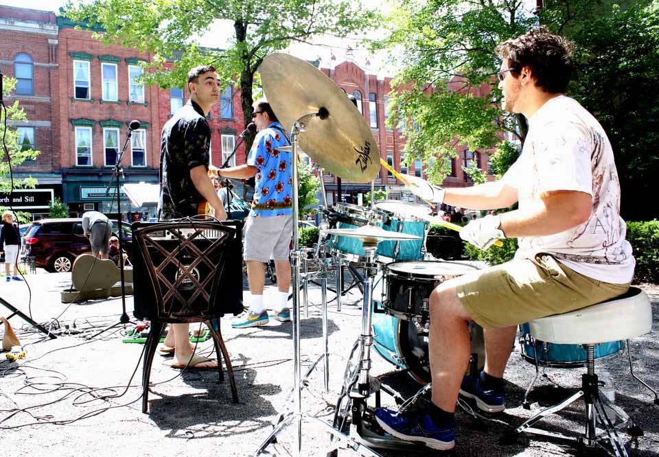 The rock and roll of the James & Adam Duo today opened the “Music on Main” series the Cooperstown Chamber of Commerce has organized every Saturday this summer at Pioneer Park in the downtown.  Here, James Johnson Jr., left, signals drummer Eamonn Maguire, Cooperstown.  In the background is lead singer Adam Coe of Oneonta.  Johnson is the son of Jim Johnson, former proprietor of WZOZ radio in Oneonta, and who was watching from the sidelines today.  Himself a rocker, the elder Johnson said he and the son had performed the evening before at the B Side Ballroom, Oneonta, owned by his sister, Rebecca Carrington, and her husband Wayne.   Adam Kaplan is performingtoday  until 5.  (Jim Kevlin/AllOTSEGO.com)