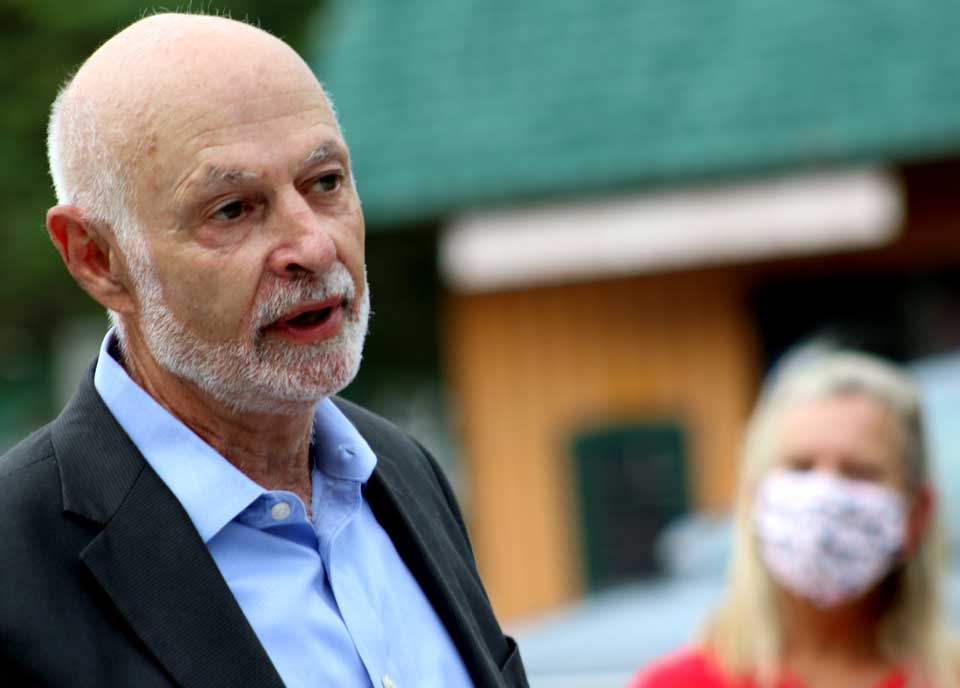 Against a backdrop of pure Americana – the Stars & Stripes, Doubleday Field and the Sandlot Kid – U.S. Senate Minority Leader Chuck Schumer, D-NY, the state’s senior senator, this afternoon pledged federal support that would go directly to local governments in the support package now being negotiated in Congress. He appeared with county board Chairman David Bliss, left, and Treasurer Allen Ruffles, who have been pleading for that kind of direct aid to municipalities (if the money goes through Albany, it can never make it here), as well as, inset left, Mayors Gary Herzig of Oneonta and Ellen Tillapaugh Kuch of Cooperstown, who detailed how their municipalities’ financials have been stricken by the coronavirus threat. He called Cooperstown “one of the hardest hit” communities due to its dependence on tourism. The senator, who makes a swing to Otsego County at least once a year, had begun the day in Buffalo and, his airplane grounded at Oneonta Airport by the weather, drove on to New York City. (Jim Kevlin/AllOTSEGO.com)