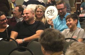 Volunteers Taylor Knox, a SUNY Oneonta senior, and Brenda Korthauer, above, cheer as a slot machine, donated by Marc and Elaine Bresee, delivers a jingling prize, setting off a bidding war at this evening’s Benefit Auction, the Greater Oneonta Historical Society’s major annual fundraiser. Inset right, Alan Michael Rubin, attending the event at the Qualilty Inn with dad Al and mom Michelle, signals his $560 bid and wins the apparatus, all for the good cause. Other items up for auction included a weekend getaway at a Lake George camp and a lamp with a stained-glass shade, courtesy of stained-glass artist Doug Halberg. After a 10-year hiatus, Kevin Herrick of Lettis Auctions, who has rejoined the GOHS board, was the auctioneer. (Jim Kevlin/AllOTSEGO.com)