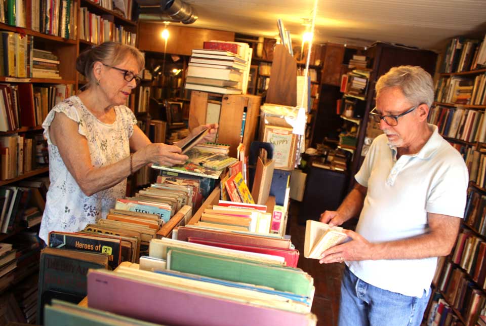 April Long, above, daughter of Bill and Lynne Compton, new owners of the former Clough’s Bookstore in downtown Cherry Valley, points out a timely artifact that surfaced as her parents were sorting some-15,000 volumes in what is now the Cherry Valley Bookstore: the front page of the New York Times from July 20, 1969. That’s 50 years ago today, as Apollo 11 astronauts were preparing to land on the moon. Bill put it in the front window of the rechristened Cherry Valley Bookstore, but wasn’t sure what it’s worth; he was researching that today. The Comptons, inset photo, purchased the store last month from Franzen Clough, who had owned it some 20 years. The couple of bought a home in Richfield Springs, moved there from Bristol, R.I., and are getting the inventory organized to their liking. Asked what the collection contains, Bill, most recently town planner in Tiverton, R.I., described it as “all encompassing,” from history to mysteries to Shakespeare to a stack of varied dictionaries and Bibles. The children’s collection, he said, seems particularly strong. Daughter April is visiting this weekend from New York City, where she is beauty editor on Town & Country magazine. The store is open Wednesdays through Sundays, from late morning to early evening. (Jim Kevlin/AllOTSEGO.com)