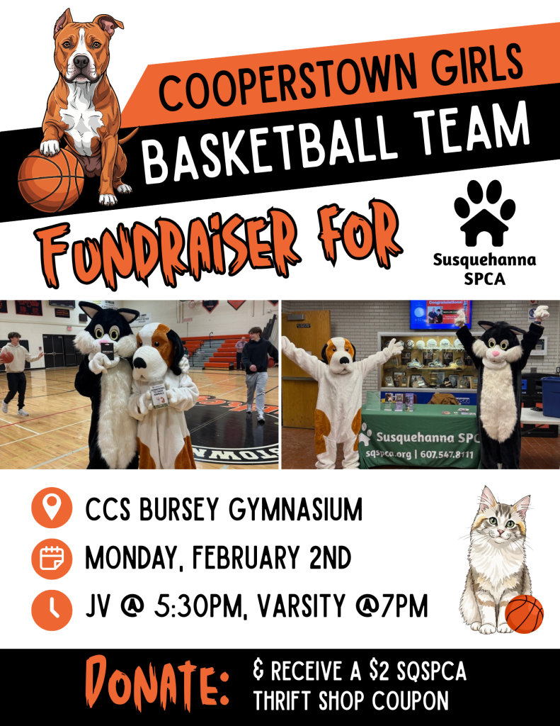 The SQSPCA’s involvement kicks off on Monday, February 2 with a special fundraising night during the Cooperstown Central School girls high-school basketball games. The junior varsity game begins at 5:30 p.m., followed by the varsity game at 7 p.m. The event is supported by a student leadership group, demonstrating the meaningful role young leaders play in giving back, animal shelter officials said. Attendees will have the chance to interact with SQSPCA mascots, and anyone who makes a donation will receive a $2.00 coupon for the SQSPCA Thrift Shop.