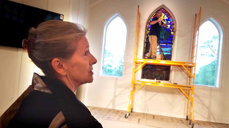 Pastor Sylvia Barrett surveys the nearly complete sanctuary – “starkly beautiful,” as Methodism’s founder John Wesley preferred – inside the new Milford Methodist Church this morning as stained-glass restorer Doug Hallberg of Oneonta reinstalls “Christ at Gethsemane,” which was almost destroyed Sunday, March 12, 2017, when the 1929 landmark on Route 28 was destroyed in an arson fire. Construction began on the new church last September, and it has become a new landmark, much remarked-upon by the thousands of drivers that passed it daily. Finishing touches are being done on the modern structure, which, pending final code approvals, is due to open soon. (Ian Austin/AllOTSEGO.com)