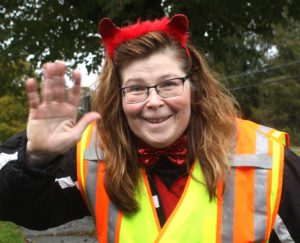 If you stick your head out the window in Cooperstown right now, you might see the Coop Loop 5K and 10K participants running by in full costume. Above, Cooperstown pals – from left, Paul Crowell, Mark Spinosa and John Luke Raymond – prepare to run the 5K. (Last year, Mark was identified as the “unidentified taco”!). At right, if you tot you taw a puddy-tat on the way to the race, you did, you did – Alena Krug, CCS high school secretary, was directing runners from her post at Susquehanna and Beaver. Due to the rain, the turnout was a little lower than usual for the Clark Sports Center event, but the runners made up the difference in enthusiasm. (Jim Kevlin/AllOTSEGO.com)