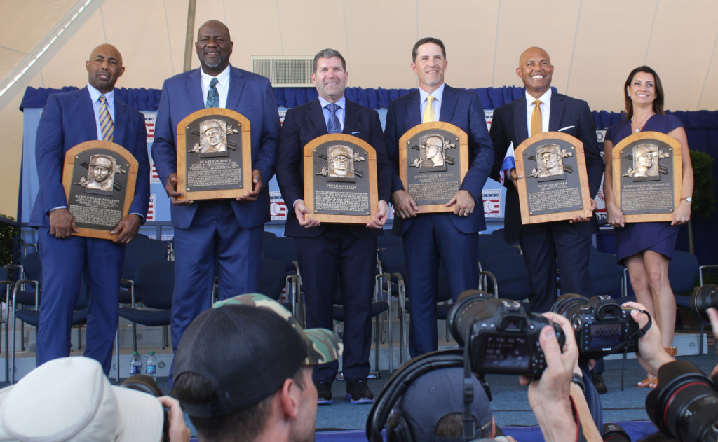 HALL OF FAME INDUCTION 2019 Baseball Hall Of Fame Welcomes Class Of ’19 55,000 Fans Attended, 2nd Largest The 2019 inductees into the Baseball Hall of Fame – from left, Harold Baines, Lee Smith, Edgar Martinez, Michael Mussina, Mariano Rivera, and Brandy Halladay, accepting the plaque posthumously on behalf of her husband Roy Halladay – pose for a group photo on the stage following their Induction ceremony earlier today in the field next to the Clark Sports Center.  If your…