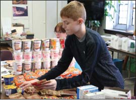 Ethan Winner, an eighth grader at Oneonta Middle School, packs food in plastic bags for United Way’s “Warm Inside and Out!” program. The bags of food and warm clothing will hang in Huntington Park until the end of the month for people in need to help themselves.