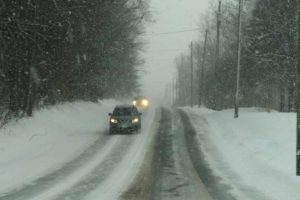 Jeremy Velasco, Middlefield, top photo, walks toward his plow at the county Highway Department, Linden Avenue, Cooperstown, after using the backhoe to fill the box from the mountain of salt in the storage building. A winter storm watch is in effect, but only about 1 inch is expected to fall. Nonetheless, roads are slick, as drivers heading south on Route 28 near Dreams Park, inset photo, can attest. Fender-benders included a car sliding into the Cooperstown Commons entry sign, denting the laid stone foundations. (Jim Kevlin/AllOTSEGO.com)