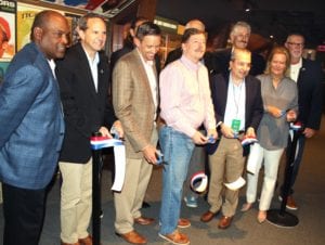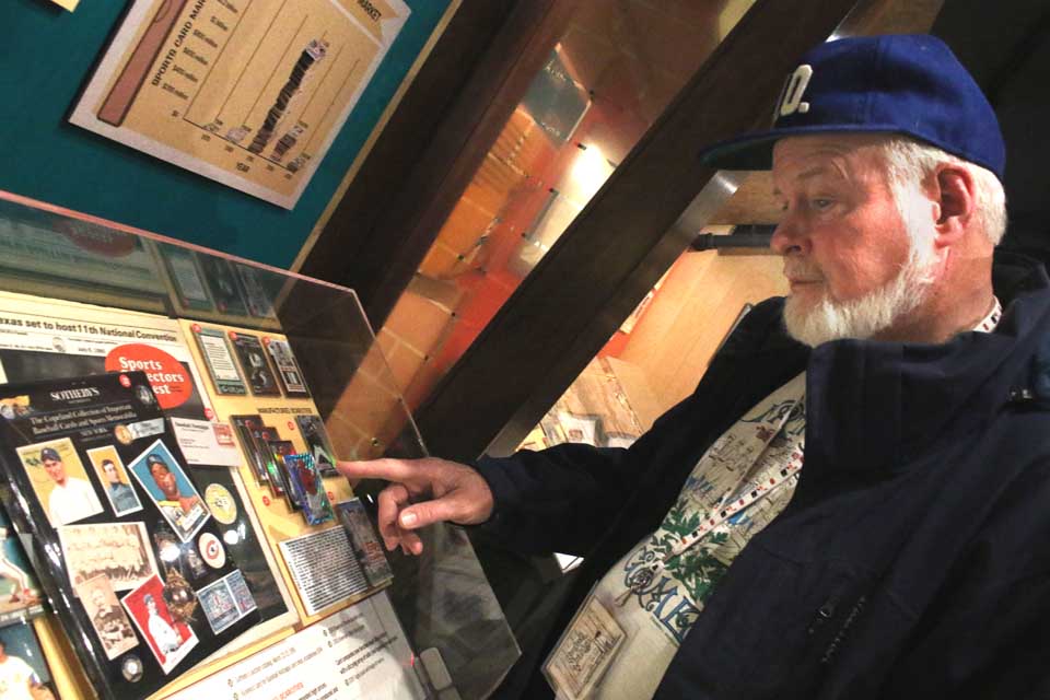 Cooperstown’s Pete Henrici, the retired CCS teacher and proprietor since the 1970s of the Baseball Nostalgia shop in the Doubleday parking, points out one of his business cards from the early days, which is part of Shoebox Treasures, a new exhibit – two years in the making – that opened this morning at the Hall of Fame.   Inset is this morning’s ribbon cutting, with Hall President Jeff Idelson and Chairman Jane Forbes Clark flanking Bill Janetsheck and two other main donors to the exhibit.  Hall of Famers visible in the background are, from left, Barry Larkin, Rollie Fingers and Bert Blyleven.  Other locals attending included the father-son partnership Will and Willis, who run Willis Monie Books, and helped curator John Odell assemble the exhibit, which Jane Clark noted included as least two one-of-a-kind cards – a 1923 Casey Stengel and the rarest of all, the Honus Wagner card from 1909.  The 11th annual Hall of Fame Classic, featuring Hall of Famers and MLB stars, stars at 1:05 p.m.  Tickets available at Hall. (Jim Kevlin/AllOTSEGO.com)